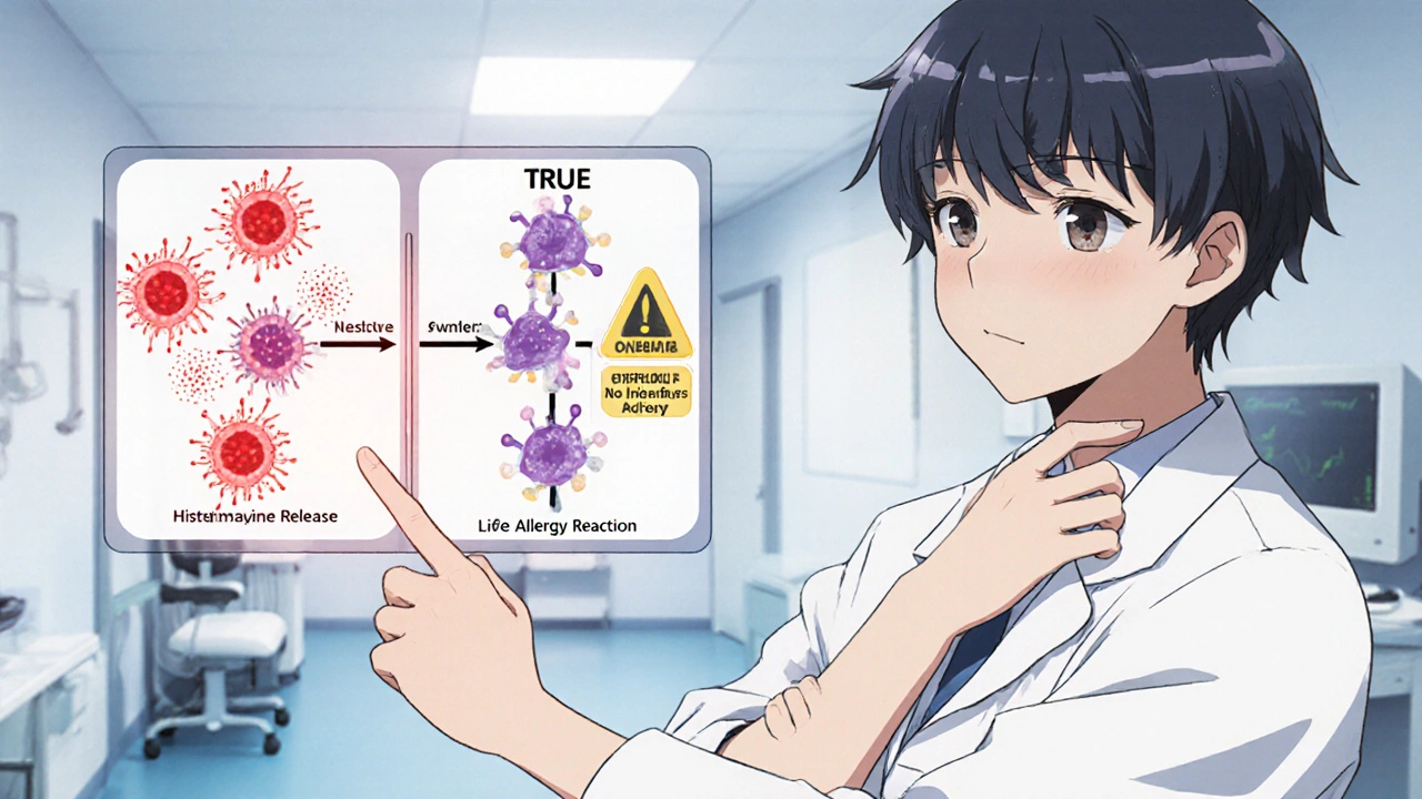 True opioid allergies? They’re rare. Less than 0.3% of people who take opioids have a real IgE-mediated immune response. That means hives, swelling of the throat, trouble breathing, or a sudden drop in blood pressure. These reactions happen fast - within minutes. And they’re life-threatening. But if your only symptom is itching, especially if it shows up after a dose increase or IV push, it’s almost certainly not a true allergy.